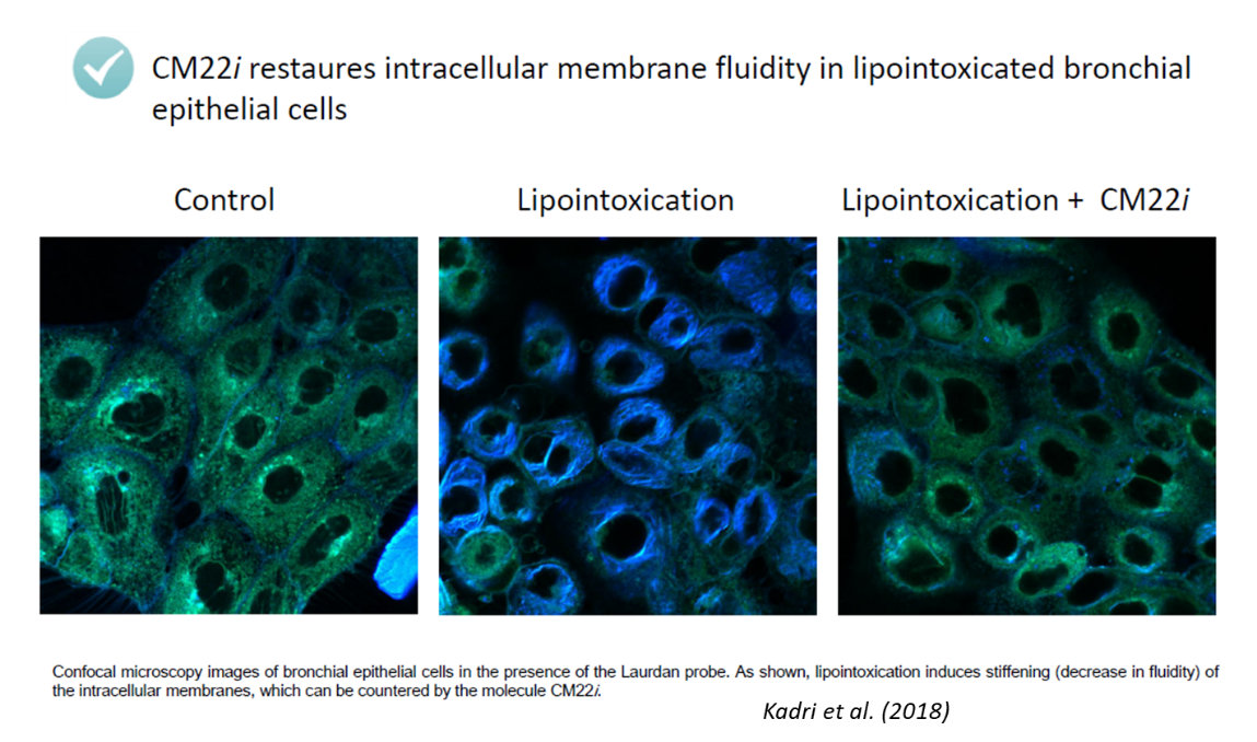 Figure 2 : CM22i restaure les propriétés membranaires de cellules épithéliales bronchiques lipointoxiquées. Images de microscopie confocale (Plateforme ImageUP) de cellules épithéliales bronchiques d’un patient mucoviscidosique (cellules CFBE) en présence de la sonde Laurdan, dont la longueur d’onde d’émission varie en fonction des propriétés membranaires. Une couleur verte est caractéristique d’une membrane faiblement organisée (fluide) et une couleur bleue d’une membrane ordonnée (rigide). Comme montré, la lipointoxication induit une rigidification (diminution de la fluidité) des membranes intracellulaires, qui peut être contrée par la molécule CM22i.