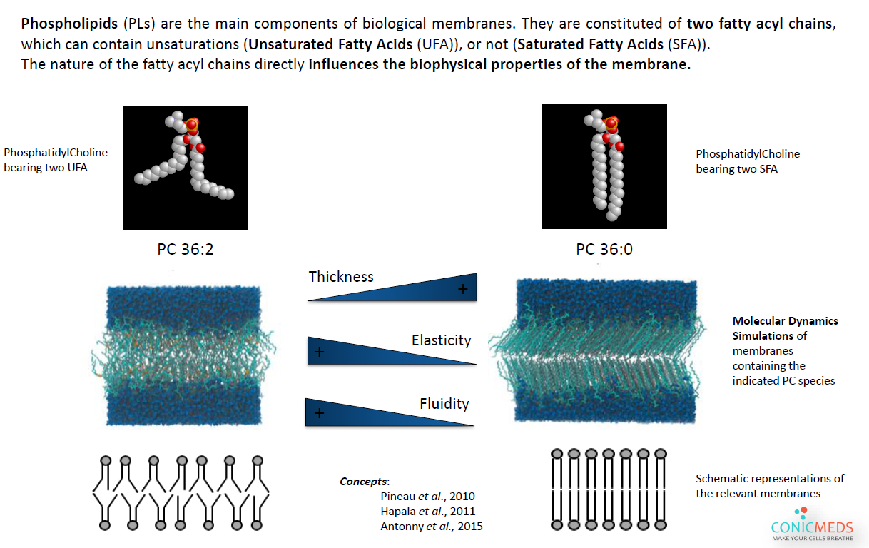 Par ailleurs, notre équipe a élaboré le concept (Deguil et al., 2011), puis participé à une étude fondatrice ayant permis de démontrer que les AGPI n’étaient pas simplement de « supers AGMI » mais présentaient la propriété de se contorsionner pour générer des membranes plastiques et extrêmement déformables (Pinot et al., 2014). Par contraste, les AGMI, du fait de leur simple double liaison, tendent à former des coudes au sein de la membrane, générant en conséquence des membranes élastiques, mais peu déformables. L’ensemble de ces résultats démontre donc que les contenus en acides gras des phospholipides, dans une membrane donnée, ont été scrupuleusement sélectionnés au cours de l’évolution pour répondre à des besoins physiologiques particuliers.