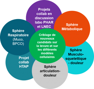 Les lipointoxications se caractérisent par une accumulation d’acides gras saturés dans les membranes des cellules de notre organisme, ce qui affecte leur bon fonctionnement. Les maladies ciblées comprennent les maladies respiratoires obstructives, telles que la mucoviscidose et les maladies pulmonaires obstructives chroniques (BPCO), la douleur, mais aussi les syndromes métaboliques, responsables du diabète de type 2, de la stéatose hépatique et de certaines maladies cardiovasculaires. Notre laboratoire coopératif a pour objectif de développer la recherche fondamentale nécessaire pour aboutir à un candidat-médicament stabilisé. Il permet de réfléchir très tôt à la mise en œuvre du médicament et ainsi d’optimiser les essais cliniques en creusant certaines pistes de recherche et en en éliminant d’autres. Actuellement, nous intéressons à plusieurs physiopathologies comme le montre le schéma des différents projets de LitCh.